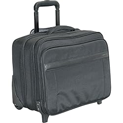 Made of weather-proof 1680-d ballistic nylon with moisture resistance laminated vinyl. Quarto compartment plus one front compartment, design to fit in overhead bin on most passenger airline.Comfortable center carry handles have heavy padding, front pockets is a cell phone pocket, perfect for keeping necessities close at hand. Designed to fit in overhead bin on most passenger airlines. The organizer has pen loops, a pocket for business cards, and padded gusseted pockets. center multi compartment, with two step file folder pockets each measuring 15" across. top of file folder comes with a zipper pocket for cables and more. Special design polyurethane stabilized frame-rolling system, with big roller skate wheels. the big wheels are toward outward taking less inner space and smooth rolling. Top loading with removable padded laptop pack with disk and cable pockets. size: 14.8 x 12 x 2 inch. Padded back compartment with tie down strap secures clothing. this compartment is for your business essentials or a change of clothing. Rubberize slip-resistant handle cart system with easy push button. telescoping trolley handle extends to a max height of 41". handle hides in zippered pocket when not in use. professional heavy duty zipper and hardware.