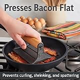 - HIC Kitchen’s Bacon Press flattens bacon strips for even cooking and crispier results while minimizing unwanted curling for perfect presentation. Made from heavyweight cast iron with a stay-cool wooden handle, this press retains and distributes heat evenly for consistent performance. Measuring 6.75 x 4 x 3.25-inches, its rectangular design covers multiple bacon strips or sandwiches at once, ideal for preparing burgers, steaks, paninis, grilled cheese, and quesadillas with professional sear marks and reduced cooking time. Safe for use in non-stick pans with careful use, it can also flatten sausage patties or hash browns, making it a versatile kitchen tool for everyday meals and stress-free holiday entertaining. Hand wash after each use and dry thoroughly. Before first use, coat the frying pan and press surface with cooking oil and heat on low for 20 minutes to season the cast iron. Brought to you by HIC, a third-generation family owned and operated company in the USA since 1957.