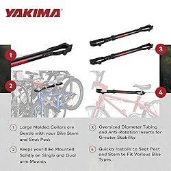 Versatile Compatibility: Adapter accommodates bikes with sloped top tubes so you can mount your bike on a mast-style hitch rack; Can be used as an adapter to mount your bike on a single or dual arm mount. Quick Installation: Installs quickly and securely to your bike's seat post and stem, ensuring minimal setup time and maximum convenience. Suitable for a wide range of bikes including mountain bikes and cruisers. Enhanced Stability: Features oversized diameter tubing and anti-rotation inserts for superior stability, keeping your bike securely mounted during transport. Adapter bar supports 1 bike up to 45 pounds. Molded Collar Design: Large molded collars ensure gentle contact with your bike's stem and seat post, preventing damage during transportation; Dimensions: 22”L x 1”W x 1”H Take It Easy: Since 1979, Yakima has worked to simplify the way people travel and transport recreational sporting equipment. We put safety, sensibility, and street smarts into every product design.