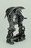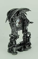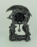 - Made of cold cast resin, this incredibly cool battery-powered desk or mantel clock features a pentagram pendulum and has an evil-looking dragon perched atop it. The clock face features a full moon cloudy night sky graphic, black hands, and white hour markers. It measures 13 1/4 inches tall, 9 inches wide, and 4 1/2 inches deep. It runs on one AA battery (not included). This clock makes a great gift for any fan of the macabre.