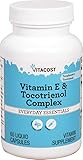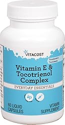 - What is Vitacost Vitamin E & Tocotrienol Complex?Vitacost Vitamin E & Tocotrienol Complex is a full-spectrum vitamin E complex supplying natural vitamin E, plus a blend of natural mixed tocopherols and tocotrienols.Vitamin E in its natural form, d-alpha tocopheryl, is an essential, fat-soluble nutrient that functions as an antioxidant and supports a number of body processes. Natural vitamin E is twice as effective by weight as the synthetic form of vitamin E.*Tocopherols and tocotrienols are components of the vitamin E family found in plant oils and cereal grains such as oats, barley and rye. Theyre believed to work synergistically to protect cell membranes and DNA from the damaging effects of free radicals.*How does Vitacost Vitamin E & Tocotrienol Complex support health?Because vitamin E is an antioxidant, it can reduce the damage that free radicals cause to the body.* Vitamin E supports eye health.*Vitamin E supports a healthy blood system.*Scientists are investigating whether, by limiting free-radical production and possibly through other mechanisms, vitamin E might help delay undesirable health consequences related to free radicals.*Gamma tocopherol has been shown to have powerful antioxidant properties. In particular, it works to scavenge some of the most damaging free radicals, such as nitrogen dioxide (a major constituent of vehicle exhaust and cigarette smoke) and peroxynitrate (formed during regular cellular metabolism).*Why choose Vitacost Vitamin E & Tocotrienol Complex?Supplies natural vitamin E, plus mixed tocopherols and tocotrienols.Features Tocomin, a full-spectrum palm tocotrienol complex with the highest ratio of alpha-, beta-, gamma, and delta-tocotrienols. Tocomin is non-GMO and certified kosher.Suitable for vegetarians.Contains 60 servings per bottle.High quality at an incredible value.About VitacostAll Vitacost products are laboratory tested to meet FDA standards for identity, purity and composition. All products are ...