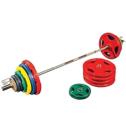 • The Body-Solid 300 lb. Colored rubber grip Olympic plate set features heavy-duty rubber coatings to help prevent damage to equipment and floors. Integrated metal sleeves provide a secure fit on most Olympic bars, and a quad-grip design offers safe lifting. Includes 14 weight plates, a 7' Olympic bar and 2 Olympic spring collars.