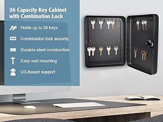 100% Steel Made in the USA or Imported KEY CABINET - Secure wall mount lock box with lock boxes for flexible key storage. Keep keys organized and easily accessible. 🌈✨ COMBO LOCK - Organize and secure up to 36 keys with ease using our key cabinet equipped with a reliable combination lock for added protection. 🗝️🔒 STREAMLINED LABELING - Numbered stickers enhance key cabinet organization, simplifying key tracking and retrieval with efficient labeling. 🏷️🔍 KEY MANAGEMENT - Efficiently manage and secure keys for various settings like homes, offices, and businesses with the convenience and reliability of a key cabinet. 📝📋 WALL MOUNT - Comes with mounting hardware for easy installation. Keep keys safe and accessible, hassle-free. 🛠️💡 Includes mounting hardware and numbered stickers Resettable combination lock for key-less entry allowing for multiple user access 36 Positions for keys Convenient turn knob to open the safe/ continuous piano hinge allows for this key box to open flat Outer Size: 9.5" x 3.25" x 11.75"
