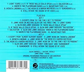 - A NEVER-BEFORE RELEASED special CD/DVD package containing a RARE 1983 performance by multi-platinum recording artist Glen Campbell and famed songwriter Jimmy Webb; two artists with deep mutual admiration for each other whose past collaborations resulted in timeless, chart-topping hits like "By the Time I Get to Phoenix," "Wichita Lineman," "Galveston" and "Where's the Playground Susie" among others.