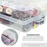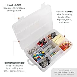 VERSATILE STORAGE: Perfect for storing jewelry findings, sewing notions, fishing tackle, screws, nails, hardware, office supplies, and craft embellishments. Can also work as a travel jewelry box or a bead organizer. EASY-ACCESS ROUNDED BOTTOMS: Each of the nine compartments (eight measuring approx. 2.3″ × 1.6″ and one 2.3″ × 1.0″) features smooth, rounded bottoms that make it effortless to remove even tiny pieces, no more stuck beads or tangled findings. SPILL-RESISTANT LID DESIGN: The lid features built-in channels that keep items in place, preventing small parts from shifting into other compartments, ideal for crafters and DIYers who work with delicate or precise materials. STACKABLE WITH INTERLOCKING FEET: Designed with raised stabilizing feet that fit into the indentations on another box’s lid, allowing secure stacking and tidy workspace organization. Perfect for building your own modular storage system. SECURE SNAP-LOCK CLOSURE: Two sturdy snap locks keep the lid firmly closed to prevent spills during transport or storage. The translucent plastic construction makes it easy to identify contents without opening the box.