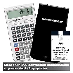 CONVERT MORE THAN 70 UNITS in U. S. Imperial, metric and other units of measure for reliable data input and conversion; enter measurements just like you say them; you can enter data in various formats and change solutions to preferred read out; you can enter feet, inch, fraction or decimal inch, other units are entered in whole or decimal numbers GIVES YOU OVER 500 CONVERSION COMBINATIONS with no need for complex scientific calculators or memorizing conversion formulas; for your ease the most common 86 measuring units are included as set dedicated function keys; you can use the preference setting to configure the calculator to work like you want and keep your preferences until a full reset EASILY WORK IN AND CONVERT BETWEEN measurement formats by pressing the conversion key and then the desired unit key, it is that easy and accurate. Then you can add, subtract, multiply and divide your results to get to the solution you need. TIME-SAVING BUILT-IN CONVERSIONS give you all the most common units you need to get your job completed in an accurate fashion; whether it’s a linear, area or volume dimensional item, weight, temperatures, velocity, flow rate, pressure, torque, energy, power or another calculation you can convert it so it matches your workflow and project requirements INVALUABLE' TOOL PAYS FOR ITSELF DAILY by reducing headaches, saving time, improving conversion accuracy and preventing expensive errors on all your calculations from large to nano units; comes with a protective slide cover, easy-to-follow quick reference guide and handy pocket reference guide, long-life battery and a full one-year limited REESE’S LAW COMPLIANT BATTERY DESIGN – Button-cell battery compartment is secured with a tool-required fastener to help prevent unintended access and align with current U.S. federal safety requirements (16 CFR Part 1263). Battery compartment remains secured during normal use, transport, and handling.