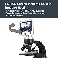 3.5" LCD SCREEN MOUNTED ON 180° ROTATING HEAD: View specimens in vivid detail without eyepieces and easily rotate the screen to share observations in group or classroom settings. 5MP DIGITAL CAMERA WITH VIDEO RECORDING: Capture high-resolution still images and smooth 30 fps video directly to an SD card—ideal for documentation and presentations. MAGNIFICATION UP TO 1600X: Features 4x, 10x, and 40x objective lenses combined with a 10x digital eyepiece for optical powers of 40x, 100x, and 400x. Use the 4x digital zoom on the LCD screen to achieve total magnification up to 1600x. ADJUSTABLE MECHANICAL STAGE WITH DUAL ILLUMINATION: Easily move and position slides with the precision-controlled mechanical stage, while top and bottom LED lighting provide bright, adjustable illumination for optimal viewing. 2 GB SD CARD AND TV OUTPUT INCLUDED: Save images and videos to the included SD card or display on a TV or monitor via AV output for large-scale viewing. DUAL POWER OPTIONS FOR FLEXIBILITY: Operates on 4 AA batteries (not included) for use in the field or plugs into the wall with the included international AC adapter—perfect for home, classroom, or on-the-go exploration. UNBEATABLE WARRANTY & SUPPORT: Buy with confidence from Celestron, a leading telescope brand in California since 1960. Your purchase includes a 2-Year US Warranty and unlimited support from our team of US-based experts.