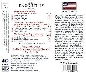 - GRAMMY Award-winning composer Michael Daugherty explores three icons of 'The Greatest Generation', a turbulent period of adversity and achievement in the United States of America spanning the Great Depression of the 1930s through the Second World War. Mount Rushmore is a dramatic oratorio inspired by the monumental sculpture of four American presidents carved into the Black Hills of South Dakota. Radio City is a symphonic fantasy on the legendary Arturo Toscanini, who conducted the NBC Symphony Orchestra in live radio broadcasts heard by millions across America. The Gospel According to Sister Aimee is an organ concerto inspired by the rise, fall and redemption of religious celebrity Aimee Semple McPherson. Under the masterful baton of Music Director Carl St. Clair, the renowned Pacific Symphony is joined by Pacific Chorale, one of America's greatest choirs, and GRAMMY Award-winning organist Paul Jacobs.