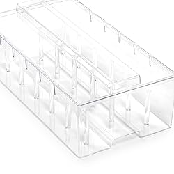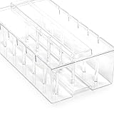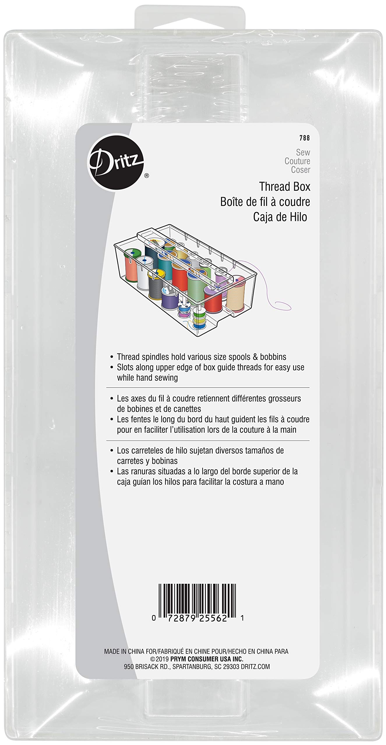 • Clear plastic thread box designed to hold all sizes of thread spools. Openings along top edge allows thread to be used without opening the lid. Indentations in lid and bottom for stacking.