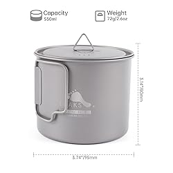 Material: Titanium Capacity: 19.4oz (550ml) Weight: Pot with lid 2.6 oz (72g) Pot only: 1.9 oz (54g) Dimension: 3 3/4" (95mm) (D) (external at lower straight part) x 3 1/8" (80mm) (H) Origin: Designed by TOAKS in California and made in China Notes: 1. Gradation: Yes, in oz and ml. 2. Comes with a lid with lockable grip and a mesh storage sack. 3. Made of 0.3mm thick titanium, one of lightest pots on market.