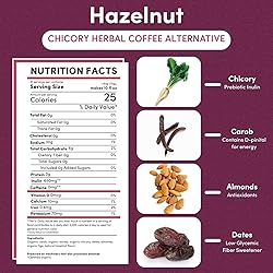 HERBAL CHICORY COFFEE - Enjoy the richness of buttery hazelnuts and golden roasted almonds over roasted chicory, carob and barley. A hint of sweetness from dates and figs. Non-GMO, organic herbs. No artificial flavors, chemicals, MSG, or preservatives. BREW TEECCINO LIKE COFFEE - Our all-purpose grind brews in any kind of coffee maker. Perfect for a cappuccino or latte, delicious hot or iced. Quit coffee by blending with Teeccino & gradually weaning off over 2 weeks. NATURALLY CAFFEINE FREE - Experience an energy boost from nutrients, not stimulants. Perfect any time of day or night because it won’t interfere with sleep. Sugar-free Teeccino is a treat for the whole family. ACID FREE - Teeccino is naturally acid free, so it won’t disturb your digestion. Replace highly acidic decaf coffee - which still has caffeine - with our 100% naturally caffeine-free coffee alternative. PREBIOTICS FOR GUT HEALTH - Inulin from chicory root is a prebiotic soluble fiber that nourishes probiotics. Each cup supports good digestion with 650mg of inulin.