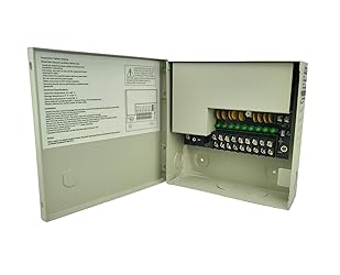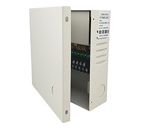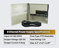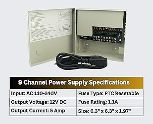 HIGH CAPACITY POWER - 12 V DC CCTV power supply box delivers 12V DC at up to 5 Amper total across 9 channel outputs - Keep 9 different outputs to neatly power up to 9 CCTV Security Cameras from one box - perfect for multi camera CCTV system projects. Input AC 110-240V WIDE COMPATIBILITY UNIVERSAL 12V DC OUTPUT with ON/OFF SWITCH - 9 channel power distribution box 12 V Work seamlessly with AHD, TVI, CVI, and standard Analog security cameras, simplifying your system installation. AHD TVI CVI analog camera power box. INDIVIDUAL PTC FUSE PROTECTION - PTC fuse protected camera power supply. Each channel has its own resettable PTC fuse to guard against short circuits or overloads, enhancing your CCTV projets safety and reliability. METAL ENCLOSURE - LOCKABLE - Durable metal housing with key lockable lid keeps your wiring secure, prevents tampering and neatly organizes your camera system. SPACE SAVING COMPACT DESIGN - Compact security camera power supply Measuring just 6.30" x 6.30"x1.97" this power box takes up significantly less wall-or-cabinet space than typical CCTV units, ideal for tight installations while still delivering full 9 channel 12V 5 Amper DC Power Output.