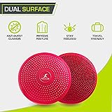 IMPROVE CORE STRENGTH & BALANCE – Strengthens and engages multiple core muscles at once to maintain balance during exercises MULTIPURPOSE - Can be used for working out or as a seat cushion to improve posture and balance, rather than using a stability ball DUAL-TEXTURED SURFACE - ensures a non-slip grip, with raised massaging bumps on one side and smoother bumps on the other HAND PUMP - Comes with a free hand pump to easily inflate and deflate to your preferred level of firmness PORTABLE - Easy to transport for fitness on-the-go. Dimensions: 14” diameter, 3” height; Weight: 2.2 lbs; Made of PVC