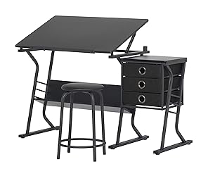 - This 3-piece Center by Studio Designs provides a comfortable work space and keeps your supplies easily accessible. The table top is adjustable up to 40 degrees and includes a 24’’pencil ledge that slides up and locks into place when needed. The set also features three adjacent storage drawers and a padded stool. The durable heavy gage steel construction includes six floor levelers for stability. Main work surface: 35.5’’W x 23.5’’D. Overall assembled dimension: 49’’W x 24’’D x 30’H