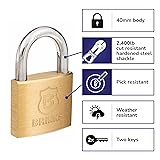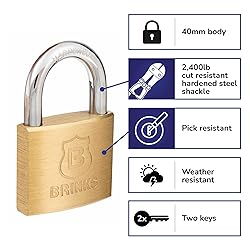 FEATURES: Brink’s Solid Brass Padlock has a 40mm solid brass body with chrome plated, hardened steel shackle for cut resistance. SECURITY - Equipped with a five-pin brass tumbler cylinder and double brass bolt locking mechanism for pick resistance. STRENGTH - Steel shackle has a cut strength up to 2400 lbs. IDEAL USAGE - This padlock is corrosion resistant, making it perfect for both indoor and outdoor use. Ideal for all types of uses such as locking and securing lockers, storages, garages, and toolboxes. QUALITY YOU CAN TRUST: A global leader in security-related products and services, the Brink's name is synonymous with top quality products to keep you and your belongings safe.