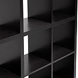 - Why hide your book collection or treasures behind doors when you can display them elegantly? The Sunna Designer Shelving Unit is a 12 cube-based modern bookshelf made of dark brown faux wood grain paper veneer over a frame of engineered wood. Silver plastic legs with non-marking feet complete this Malaysian-made modern display unit. Assembly is required. To clean, wipe with a dry cloth. Dimensions: 61 Inch high x 58.25 Inch wide x 11.5 Inch deep Shelf dimensions(12): 13.25 Inch high x 13.25 Inch wide x 11.5 Inch deep.
