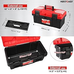 16-inch Tool Box, Internal size 14.5" x 5.5"(LxH), External size 16" x 8" x 8" (L x W x H), around 2.68lb, Small empty tool boxes suit for home use Basic tool box with handle, comforable for griping, lightweight for carrying, and build-in padlock eyes ( LOCK NOT INCLUDE ) Made of Rugged polypropylene resin construction, portable handheld tool box with lockable latches, keep your hand tools safe Plastic tool box with removable interior tray, fit to storage wrenches, sockets, screwdrivers etc, A bright red plastic toolbox is a nice gift choice for new homeowner and DIYers Comfortable grip handle, transparent lid on either side to store small screw, nut etc MAXPOWER Tool Box, max load weight 33lb