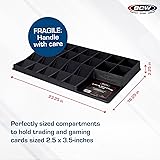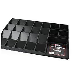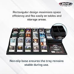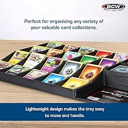 24-Cell Card Tray Organizer: This card sorting tray includes 15 deep cells, 5 shallow cells, and 4 square cells—perfect for organizing Pokémon cards, baseball card storage, and other TCGs. Compact & Lightweight Organizer: Measuring 23.25"" x 16.25"" x 2.25"", this BCW card sorting tray is a no-frills, thin plastic card tray organizer designed for basic storage and sorting of standard-size trading cards. Perfect for All Collectors: Use this card sorter tray for casual or professional pokemon card storage, sports card sorting tray needs, or general tcg card storage organization. Safe and Durable Design: Crafted from smooth, black plastic with rounded edges, this trading card organizer helps sort unsleeved cards and packs during card shows or home use. Multi-Use Sorting Tray: Great for tcg storage, card games like Lorcana, or as a board game piece organizer. The bcw sorting tray brings convenience to game nights and vendor displays.