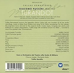 - 2014 Maria Callas remastered series reissue. With this Abbey Road 24-bit 96kHz remaster, engineers returned to the original master tapes, bringing new clarity & brilliance to her legendary studio recordings. Callas sang the role of Turandot 24 times on stage, in the late 1940s. It was the role originally planned for her US debut, but the opera company went bankrupt and the performances (scheduled for Chicago in 1947) never took place. She brings unusual subtlety to Puccini's icy princess, while Elisabeth Schwarzkopf - more readily identified with Fiordiligi and the Marschallin - is surprise casting as the self-sacrificing Liu.
