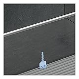 - Progress Profiles - ProLeveling System - Linear Levelers (PRSL) are designed to fit where two surfaces adjoin to create a level surface and even spacing. The Progress Profiles ProLeveling System is a revolutionary and innovative tile leveling system that is ideal for laying medium and large materials with a thickness of between 2 and 40 mm. This patented system consists of three elements: a leveling base (of 1, 2, 3, or 5 mm) with spaced notches for spacing/separating/joining floors in all kinds of material. a threaded stem central to and perpendicular to the base, with various easy snap-off points. a pommel cap (sold separately) that tightens down on the stem and base creating a level surface. The threaded stem is attached perpendicularly to the leveler base in a way that allows for easy adjustment with turns of the pommel cap during installation. Removal of the cap and Stem after the materials are set is made easy with strategically placed breakage points that release with either increased pressure by turning the cap or by kicking the cap in the direction of the joint. One cap fits all threaded stems and can be reused an infinite amount of times for big cost savings. The new patented Progress Profiles ProLeveling System - PPLS assists in the reduction or elimination of ledging and lippage in the installation of various types of materials that are applied to floors or walls with mortar including: Large Format Tile, Natural Stone, Thin Profile Tile and many others.