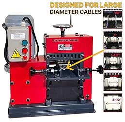 - CopperMine Electric 2HP Large Cable Wire Stripper Looking for a reliable and efficient way to tackle those big cable stripping jobs? Meet the CopperMine CT-410 – your new best friend for handling large-diameter cables and copper wires with ease! This powerhouse of a machine is designed for serious DIYers, electricians, and anyone who needs to strip wires without the hassle. Key Features: -Massive Power: With a robust 2HP motor, this is the largest original table-top cable wire stripper out there, capable of handling cables up to 3-1/2" in diameter. That means whether you're working with standard or armored cables, you can strip them down quickly and efficiently. Built to Last: Each CopperMine machine is proudly engineered in the USA using top-quality parts. It's designed to meet OSHA safety standards, so you can strip with confidence knowing you’re using a reliable and safe tool. High Efficiency: Say goodbye to the old, tedious methods! This machine features opposing blades that make a double cut on insulation, getting that copper out in just one pass. Plus, you can easily adjust the cutting depth for different insulation thicknesses – whether it’s 3/16" or 3/8" (5mm or 10mm), you’ve got it covered. Versatile Wire Capacity: Perfect for all your large wire needs, the CopperMine CT-410 can strip cables ranging from 1/2" to an impressive 3-1/2" (13mm to 89mm) in diameter. No more struggling with those bulky cables! Convenient Power: No complicated setups here! This machine runs on a single-phase 2HP motor that easily plugs into any standard wall outlet (110-120VAC). Just plug it in, and you’re ready to go! Whether you’re a DIY enthusiast, a contractor, or just someone who wants to make cable stripping a breeze, the CopperMine Electric 2HP Large Cable Wire Stripper is your go-to tool. Get ready to streamline your wire stripping process and make your projects more enjoyable. Grab yours today and experience the difference! Note *The above range of wire gauges are for typical wire products. Due to the variety of wire structures actual range may vary. Try it for 30 days and if it does not meet your expectations, just return it for a full refund of the purchasing price, no questions asked!