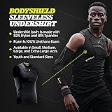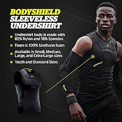 UNMATCHED IMPACT PROTECTION: BodyShield Sleeveless Undershirt absorbs up to 90% of impact; Made with 3mm XRD Extreme Impact Protection ergonomic rib pads; Equipped with slow rebound chest pad for ease of chest trapping; Prevents bruises, cuts and contusions; Ideal for soccer and heavy-duty sports FORM-FITTING COMFORT: Features innovative technology to control chest long-passes; Flexible yet heavy-duty Poron XRD foam padding on ribs maximizes comfort and safety; Form-fitting body and sleeveless arm design allows arms to stay in place without hindering upper body mobility; Removes distractions and improves performance; Ideal for layering BREATHABLE ALL-DAY PLAY: Equipped with moisture and sweat-wicking materials to ensure breathability in all situations while keeping odors at bay so you can play harder without sacrificing comfort SUN PROTECTION: We've got you covered with UV-resistant materials that shield you from harmful UV rays PREMIUM MATERIALS: Undershirt body is made with 82% Nylon and 18% Spandex; Foam is 100% Urethane foam; Available in Small, Medium, Large, and Extra-Large sizes; Youth and Standard Sizes