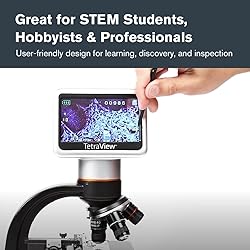- The Celestron TetraView LCD Digital Microscope is a powerful, full-featured biological microscope designed for classrooms, labs, and hobbyists. With a 4.3" full-color LCD screen mounted on a 180° rotating head, multiple users can view specimens simultaneously—perfect for group learning or collaborative environments. The screen eliminates the need for eyepieces and reduces eye and neck strain during extended use. The microscope includes a 5MP digital camera sensor that captures sharp still images and 30 fps video. Capture and save your observations directly to the included SD card or connect the microscope to a monitor using the TV output for large-scale viewing. Image resolution up to 3648x2048 pixels ensures excellent clarity, even on bigger screens. The rotating objective turret features 4x, 10x, 20x, and 40x lenses. When combined with the 10x digital eyepiece, this delivers 40x, 100x, 200x, and 400x optical magnification. The LCD screen features an additional 4x digital zoom, allowing the microscope to reach a total magnification of up to 1600x. This makes the TetraView ideal for examining slides containing cells, tissue, protozoa, and more. The fully adjustable mechanical stage allows precise slide positioning, while coarse and fine focus knobs ensure crisp imaging. Just below the stage, there is a built-in 6-position filter wheel that includes color and aperture filters to enhance contrast and control lighting for clearer specimen viewing. An adjustable bottom LED illuminator beneath the mechanical stage provides bright, even lighting—ideal for viewing translucent specimens on prepared slides. Power the microscope using the included international AC adapter or go cordless with 4 AA batteries (not included), offering flexibility for use indoors or in the field. The microscope comes with 7 prepared slides, two cables, a touch pen, a dust cover, and a rugged canvas carrying case—everything you need to start exploring the microscopic world.