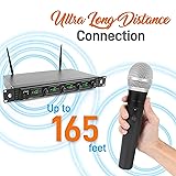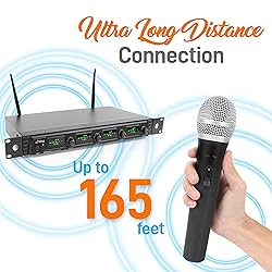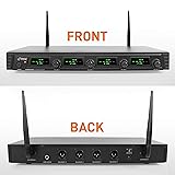 TECHNICAL SPECIFICATIONS - UHF Band, Quad Frequency, 4 Channels, High Signal/Noise Ratio, RF & AF LED Indicators, 4 XLR Outputs, Detachable Antennas, Receiver Dimensions: 15.5'' x 9.3'' x 2.2'' CLEAR SOUND QUALITY - Enjoy distortion-free vocals with high signal over noise ratio, ensuring your performance is heard loud and clear without interference, unlike typical VHF units. CUSTOMIZABLE VOLUME CONTROL - Each channel has independent volume settings, allowing you to balance audio levels and tailor the sound to any event, ensuring professional-grade output. VERSATILE CONNECTION OPTIONS - Multiple output jacks, including 4 balanced XLR and a 1/4"" phone plug, enable seamless connectivity to various devices, enhancing setup flexibility. ALL-INCLUSIVE PACKAGE - Comes with 2 handheld, 2 headset, 2 lavalier mics, 2 transmitters, 8 batteries, and a power adapter, offering everything needed for a complete audio solution. IDEAL FOR VARIOUS EVENTS - Suitable for karaoke, PA systems, DJ parties, conferences, schools, or churches. Perfect for professionals and amateurs seeking reliable audio performance.