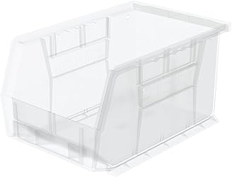 MULTI-PURPOSE STORAGE BINS: These stackable storage bins hold up to 20 pounds and are great for closet organization, classrooms, garage storage, pantries, craft storage, bathrooms, and more; Use them to store snacks, toys, or as a tool organizer DURABLE ORGANIZATION: Crafted from heavy-duty, one-piece industrial plastic, these bins are rust, water, and corrosion-proof; Reinforced side ribs add strength and prevent spreading; Each storage bin is easy-to-clean and can be used indoors or outdoors SPACE-SAVING DESIGN: These stackable plastic bins are sized to fit 1 bin in front of the other on 18" deep shelving to create a 2-bin Kanban system; Extra-wide stacking ledge provides stability, saves space and prevents spills CUSTOMIZABLE ORGANIZATION: Optional dividers and label holders (sold separately) let you tailor the heavy duty storage bins to your specific needs for any project or space; They also can be used with louvered panels or rail racks (sold separately) STACKING BIN DIMENSIONS: Outside Dimensions - 9-1/4" x 6" x 5"; Inside Dimensions - 8-9/16" x 4-7/8" x 4-3/4"; Curved-bottom hopper front makes it easy to retrieve small parts; Proudly made in the USA