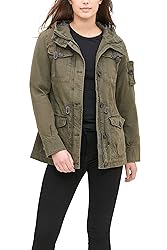 - Garment dye cotton four pocket field jacket with attached hood.