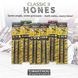 WARTHOG SHARPENERS: Most people struggle trying to sharpen a knife properly, so we created a sharpener that allows you to quickly get a sharp, accurate edge, and you can enjoy using your knives again. PRODUCT MODEL: C2SXC, EXTRA COARSE 270 Grit Replacement Hones for the Warthog V-Sharp A4 Knife Sharpener System. The V-Sharp hones come in 6 configurations ranging from Extra Coarse (270), Coarse (325), Medium (600), and Fine (1000). Each has a diamond hone on one side and a honing steel on the other. Medium/Fine and Medium/Course do not come with a hone and have diamond hones on both sides. GET THE EDGE: Sharpening a knife can indeed be a tedious task, but not with the Warthog Knife Sharpener. Ideal for home cooks, professional chefs, gardeners, homesteaders, hobbyists, avid fishermen, and hunters. Pass on all the electric, rolling, and tumbling gimmicks. Throw out all the time-consuming whetstones and get a razor-sharp edge with minimal effort. Just a few quick strokes will get your dull knives sharper than when you first bought them! EASY TO USE: These two durable replacement hones are intended for use with the V-Sharp A4 & Classic II Knife Sharpener Systems. They offer an extra level of polish on your blade and are easy to install. Simply clip in the hones to the V-Sharp A4 or Classic II Sharpening System and you are good to go. DURABLE & VERSATILE: These replacement stones come in various grits, allowing them to smooth the rough edges and put a razor-sharp edge on your blade.