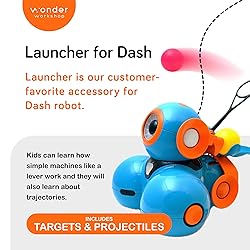 LAUNCHES THRILL: Our dash robots and launcher duo offer projectile action for kids aged 6-11. The launcher, powered by the Dash toy robot, helps kids learn about trajectories and how simple machines like levers work. BUILD VERSATILE TARGETS: With three launchers and six stacking targets, kids can build intricate targets using compatible bricks (not included). You can also set up a hoop or use a cup and let Dash the robot shoot baskets from a distance. APP COMPATIBLE: Use the free mobile apps to load, launch, and reload Dash's toy launcher accessory. Adjust the power of the ball launcher for kids by using the apps to aim for different targets with precision. HOURS OF FUN: Includes 1 Launcher with balls, 3 projectiles, and 6 stacking targets. Enjoy hours of playtime with the launcher and the Dash robot with compatible bricks to create more challenging targets. AWARD-WINNING ROBOTS: Wonder Workshop's Dash robot is used in 40,000+ schools globally to teach STEM skills to their students. Keep kids engaged with Blockly, Wonder apps, and other toys in the kid's robot toy pack.