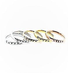 - New to our product line are these nice Stainless Steel Stackable Name Rings, they are available in Matte, Shiny, Rose Gold, Gold and Coffee colors Stainless Steel. Each ring is personalized with your choice of wording and/or dates. The rings are made of Stainless Steel that will not fade, tarnish or stain your skin. Rose Gold, Gold and Coffee colors are plated over Stainless Steel. Each ring is 3mm wide, the perfect width for stacking! **LISTING IS FOR 1 RING** ( Picture shows five individual rings which are sold separately) Change Quantity to desired number of rings and add to cart separately ****INSIDE ENGRAVING NOT AVAILABLE FOR THIS RING**** ------------ORDERING INSTRUCTIONS--------------- 1. Select Quantity 2. Select Color 3. Select Size 4. Enter personalization (35 characters max.) **Please note: Paint in rings is not permanent and will come out over time, length will vary depending on wear of ring. This can easily be repainted at any time using a paint marker and wiping excess with alcohol. Unfortunately, there is not a way to make it permanent in stainless steel, however the engraving (stamping) will always be there**