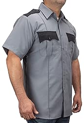 - A dark gray short sleeve shirt made of 100% polyester that has placket sleeves with a center button on each. Placket front. Double slit badge on left side of chest. X-stitched shoulder epaulets. Banded collar.