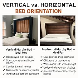 HORIZONTAL QUEEN DIY MUPRPHY BED - Cabinet finished measurements: 67-7/8 in H x 86-3/8 in W x 16 in D (closed) x 67 in D (open). See images for dimensions for hide away bed. High quality Murphy bed kit. MULTI-FUNCTIONAL - DIY Murphy Bed Kit! Enjoy a space-saving design, easy construction and assembly, and premium Wall bed hardware that transforms any room into a stylish, multifunctional oasis. PREMIUM QUALITY: USA-made innovation and craftsmanship with our bed lift mechanism Murphy bed kit. Engineered for long lasting performance. This hide away bed , delivers sleek, space-saving design. LIFETIME WARRANTY: Elevate your space with our premium DIY Murphy bed hardware. Every murphy bed kit includes a Lifetime Warranty, ensuring superior quality, peace of mind, and a space-saving design. TOP RATED CUSTOMER SUPPORT: Our U.S.-based team is ready via toll-free phone and online to support your DIY Murphy bed kit. Access 24/7 step-by-step video guides online for a seamless DIY experience. DETAILED INSTRUCTIONS: Easy DIY murphy bed hardware clear visual instructions (on paper, PDF, online videos) included. DIY Murphy Bed includes full cut list for buying and quickly cutting the lumber. NOT INCLUDED WITH MURPHY BED HARDWARE: Basic woodworking tools, lumber from the hardware store, and innerspring mattress Queen Mattress size up to 60" W x 80" L x up to 12”H and up to 85 lbs.