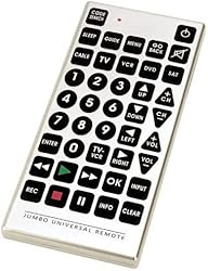 - 8 Function Jumbo Universal Remote Control. Easy Operation: Large buttons and clear labeling make this remote control simple to use for all ages. Device Support: Compatible with TV, DVD, VCR, satellite, cable box, audio systems, and other home entertainment devices. Jumbo Design: Oversized buttons provide enhanced visibility and easier access for comfortable operation. Programming Features: Quick setup process with auto-search function for device codes and manual code input options.