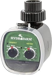 - The Hydro farm electronic water timer makes watering your plants a breeze. This single-station Analog timer attaches directly to your garden hose & automatically controls sprinklers, drip systems or soaker systems. It features two simple dials that allow gardeners to set the frequency of watering from 1 hour to 1 week & The run time from 1 min to 2 hours. This timer is easy to use & requires no wiring. Just attach it to your hose, set It & forget it. Easy to use - Suitable for all garden watering systems - No wiring required - Set watering frequency from 1 hour to 1 week - run time can be set from 1 min to 2 hours - battery powered (requires 2 AAA batteries not included).