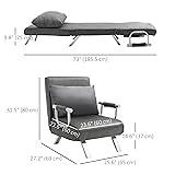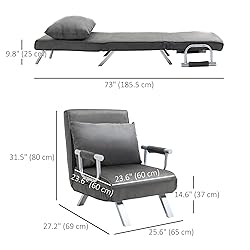 - This Homcom sleeper chair is perfect for use while playing, studying or resting and will be your most versatile option. It has multiple positions, such as a chair with armrests, chaise lounge or a bed. It undoubtedly provides the right balance of comfort and style. This amazing flip chair is sturdy, well-made and easy to transform. The modern Homcom sleeper chair is also an ideal place for reading, power naps and overnight guests. Features: - Constructed of high quality faux suede, sponge and metal frame - Backrest angle has 5 adjustable levels of comfort - Folds down to be a sofa bed or a chaise lounge - Sofa cover is detachable for convenient washing - Includes a pillow to let you be more comfortable - Metal armrests for when you use it as a chair Specifications: - Color: Grey - Material: Faux suede, metal frame, sponge - Sofa Dimension: 25.6"W x 27.2"D x 32.3"H - Bed Dimension: 23.6"L x 73.2"W x 9.8"H - Pillow Dimension: 23.6"L x 15.7"W x 7.9"H - Net Weight: 38.6lbs - Weight Capacity: 220.5lbs
