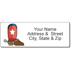 Embrace the spirit of the Wild West with our Western Boots with Texas Star Return Address Labels! Featuring a classic design of cowboy boots adorned with the iconic Texas star, these labels add a touch of rustic charm to your mail. Perfect for invitations, holiday cards, and everyday correspondence, these labels are a stylish and practical addition to your stationery. Label Size: 1 x 2.75 inches with rounded corners. Self-Adhesive white labels change of address labels. Quantity: 90 labels (3 sheets of 30 labels) Glossy finish personalized address labels.A Printed and created in the USA