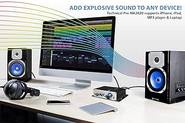 - Whoever said good things don't come in small packages never met the MA2020 Mini Amp. The MA2020 is designed to be used with smart phones, computer systems / laptops and traditional entertainment setups, or even a PA system that needs a little extra juice. On the back you can find a RCA line input and an MP3 (3.5mm) input, plus a RCA line output and bare wire speaker outputs to 2 speakers, making it easy to connect to just about anything. All of the controls you need are easy to spot and well placed for quick access. The power switch and volume controls are incorporated into one simple glowing rotary dial, so you can switch it on and adjust the volume at the same time, without having to go fumbling around looking for a tiny power button. If you prefer a totally dark room when listening, the LED light can easily be turned off as well. We have also included a standard 3.5mm headphone jack into the MA2020. Because not all music requires the same tuning and two people listening to the same song might want it to sound differently, you need total control. Some prefer more bass, while others prefer to really highlight those mid and high range sounds. To make everybody happy, there are treble and bass rotary dials on the front as well as a direct/EQ button giving you the choice to allow the sound to pass through unfiltered. Now you can customize the listening experience to your preferences. Other notable features include a 1/4 " microphone input jack and the ability to be daisy chained with multiple units. The microphone input makes the MA2020 great for PA in the classroom or professional setting. Simply connect your microphone and begin speaking. Includes a 3 Foot power cable as well as a 3.5mm to 3.5mm audio cable.