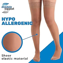 75% Cottone GRADUATED COMPRESSION 15-20mmHg - Aids circulation, beneficial for varicose veins, edema, and swelling. SILICONE BORDER - Prevents sliding down and doesn't leave skin marks, enhancing comfort. EASY CARE - Fully machine washable for convenience; recommended to air-dry to maintain shape and elasticity. DETAILED SIZE CHART - Offers precise fit based on thigh, calf and ankle measurements for maximum comfort. REINFORCED HEEL & TOE - Enhanced strength in key areas for extra durability and support during daily activities. MADE IN THE USA - Expertly crafted for superior quality and durability, ensuring long-lasting wear. REINFORCED HEEL & TOE - Enhanced strength in key areas for extra durability and support during daily activities. WHY US? - Absolute Support has been a Leader in the compression garments industry for over 25 years, Based in Brooklyn NY since 1997. We know everything about compression socks. All our products are designed and tested in the USA. WE are BETTER - Our philosophy is "Premium Quality at half the price of other American Brands". We offer many items in 10 sizes; Small to 7X-Large and many styles, which are exclusive to Absolute Support. What sets Absolute Support apart is the attention to detail and comfort. Listening and learning from our customers, their therapists and doctors, we have carefully curated our styles, chosen the best materials and created vast sizing and color options.