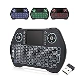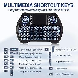 - 【Easy to Connect & Use】The mini wireles keyboard remote is connected via USB receiver(included) and the work distance up to 10 meters. Just plug and play. very easy to connect and use. Powerful function (keyboard + touchpad + mouse) very perfect for browsing the web, playing games or watching TV. 【Widely Compatibility】The mini keyboard with touchpad can be used for Android TV box, smart TV, PC, Pad, Raspberry PI, PS3, x-box, desktop, laptop, smart phone,HTPC/IPTV, etc. If there is not a USB port, you need to prepare a OTG cable. 【Mutil-Colors Backlit and Rechargeable Battery】The USB mini keyboard has mutil-colors of backlit mode which can clear operate the keys when work at night, don't need to turn on the light which disturbing your families. With auto sleep and wake-up function, and comes with a rechargeable Li-ion battery, it can work for a long time. 【Portable Keyboard】 This small keyboard is designed Small and handheld design, has a innovative shape and petite size, takes up very minimal space in you bag and just makes you say goodbye to chunky keyboard to horizon a new experience of office entertainment anywhere, anytime. 【Sensitive Touchpad & Hotkeys】Wireless mini keyboard with multi-finger touchpad and combo with 8 hotkeys can easy and accurate manipulation. Easy to type and copy / paste, making it faster and more convenient for you browse the page.