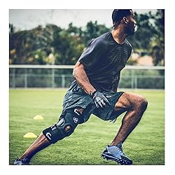 45% Nylon, 29% Neoprene, 13% Spandex , 3% Silicone, 8% Polyester , 2% EVA Hinge Technology and a four-point leverage System trains users to stay out of the "at-risk" position through a dampening cycle of the hinge Compression and thermal heat Regulation keeps you from overheating; anti-migration Technology prevents sleeve movement Adjustable straps enable greater customization for a more secure, personal fit; reflectivity for enhanced visibility in low-light conditions Designed to treat and protect ACL and meniscus injuries, joint instabilities, moderate ligament and tendon sprains, hyperextension, and patella support Intended for Use in sports similar to Football, soccer, skiing/snowboarding, basketball, lacrosse, or volleyball