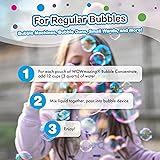 • When you think of premium bubble solution, think of WOWmazing Bubble Concentrate! It's a bubble solution from the future... these bubble refills will keep the party going! Our bubble solution is made with pride in the USA. It took years to develop a safe, non-toxic, earth friendly bubble solution that’s strong enough to create ginormous bubbles! Say goodbye to bulky, leaking plastic bottles… we use environmentally friendly pouches that consume less space and less likely to leak. The WOWmazing Bubble Concentrate was specially formulated for creating giant, high flying, and long-lasting bubbles. The set includes 3 pouches that will make hundreds of WOWmazing bubbles. Use one pouch at a time. For GIANT bubbles, simply add 1 pouch of WOWmazing Bubble Concentrate to 4 cups of tap water. For regular size bubbles, add 1 WOWmazing pouch to 12 cups of tap water. If there’s any bubble mix leftover, no worries. WOWmazing bubble solution gains strength while it sits! You'll create bigger, longer-lasting bubbles the second time around.Even though we recommend it be used with our WOWmazing wands, this solution works well with bubble machines, bubble swords, bubble hoops, bubble guns, or any bubble toys! A portion of this product’s proceeds goes to support autism research and awareness.