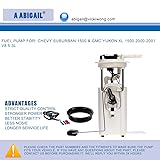【High Quality】A ABIGAIL fuel pump assembly improves the efficiency and stability of fuel delivery. Precisely built and tested to the same rigorous quality as OE fuel pumps. 【Interchange Part No.】ACDELCO MU1520, MU1618, MU171, AIRTEX E3509M, BOSCH 67308, 67431, CARTER P74836M, DELPHI FG0105, GM 19121630, 19153716, 25315983, PIERCE P1506M 【Package】Includes Fuel Pump, Sending Unit, Float, Fuel Reservoir, Fuel Strainer, Upgraded Electrical Connector and Tank Seal; Wiring Harness Included. 【Compatibility】Please Check fitment for your vehicle Year/Make/Model on compatibility dropdown / chart. No modification necessary. Images depict actual item and necessary components.