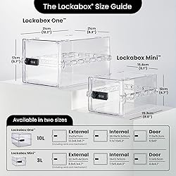 - Lockabox is a unique lockbox and is quite simply a storage container with lock! Our lock boxes for home offer inbuilt stacking sockets which enable multiple lock boxes to be stacked. Our patented clam-shell design on our lock box holds the key to Lockabox’s strength whilst efficient processing keeps our medicine safe, consistent and suitable for commercial and everyday use. Where to use: Lockabox fridge - Fridge locker - The large lockable storage box can be used as a food locker or kitchen lock box due to its unique features which protect contents from spillages, tampering and external contaminants, making it the perfect candy lock box. Lockabox medical - medicine safe: Ideal for use as a locked medicine box and medication lock box when caring for people, due to the deterrent of the clear lock box, making it a perfect locked medicine box and medication safe lock box. Shared Accommodation: Keep daily essentials safe in this Lockabox one compact, also perfect for freezers, cupboards and in shared bathrooms, acting as a food lock box. Education: Secure hazardous items in classrooms, staff rooms or use as a medicine cabinet with lock on school trips with this plastic lockable box. Lockable cabinets for home: use our lockbox as a knife lock box or child proof medicine box and control of household pills, allergenic foods and chemicals such as washing tablets with this medication lock box. Workplace office storage: Our medicine box acts as a personal lockable cabinet for stationary, private documents and electronic devices. Limiting screen time: Our electronic lock box for devices can also be used as a device lock box or phone lock box to limit screen time. Important Information Our locking medicine cabinet is designed to offer you a level of protection and acts as a deterrent to theft, Lockabox One should not be used to store high value items.