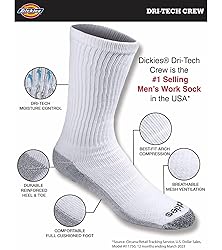 - Dickies dri-tech comfort 6 Pairs crew with wicking, moisture management fibers keeps feet dry, ventilation channels engineered for air circulation and moisture control, arch compression hugs feet and keeps socks in place, while providing in-step support, Reciprocated heel and toe for superior fit and full cushion comfort
