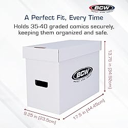 Exceptional Quality Construction: Meticulously crafted from high-grade white corrugated paper, these graded comic storage boxes offer an unmatched 200 lb. test strength, ensuring unparalleled protection for your treasured CGC Graded Comics. Double Thickness Handles & Reinforced Bottom Design: Experience the epitome of convenience and durability with our intelligently designed box, featuring double thickness handles and a reinforced bottom for effortless handling and added protection. Custom Tailored for CGC Graded Comics: These comic storage boxes are precision-engineered to perfectly accommodate CGC Graded Comics, guaranteeing a secure, snug fit that keeps your prized comic collection impeccably organized and safeguarded. Generous Capacity: Unlock vast storage possibilities without compromising on space or quality. This comic box provides ample room for 35-40 Graded Comics, allowing you to maximize storage while preserving the condition of your valuable collection. Optimal Dimensions: Interior dimensions of 8 1/4 x 13 1/4 x 16 inches preserves the pristine condition of your comics. The exterior dimensions of 9 1/4 x 13 3/4 x 17 1/2 inches showcase a sleek design that presents your collection in style.