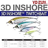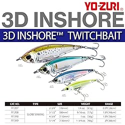 - The 3D inshore twitch bait is a slow sinking lipless hard bait with excellent balance for quick starting action around cover. Designed to be fished in shallow water the 3D inshore twitch bait is an exceptional choice for fishing grass flats, Oyster bars or working troughs along the beach. Yo-Zuri patented 3D Prism finish sends out flashes of light which fish can see from a great distance. The internal Hologram sheet never wears off and keeps on flashing even when the clear body is scratched. The deep bodied shape mirrors a variety of the baitfish that top inshore Predators target including Threadfin herring, pilchards and Peanut bunker. The strategic weight position and flat sides give the 3D inshore twitch bait an erratic darting action on a twitch and pause retrieve. Put it all together and you have a high quality saltwater Japanese hard bait at an extraordinary price point