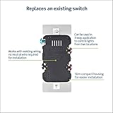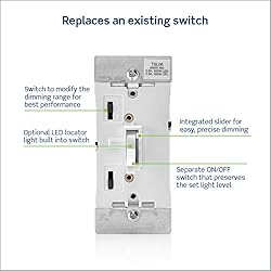 CONVENIENT - an easy way to create a big impact for a minimal cost and customize the light level in any room, for any occasion and in any home EASY TO INSTALL - slim profile fits in most wallboxes. 300W LED, 600W incandescent/halogen. Works with existing wiring, no neutral wire required for installation PRACTICAL - designed to dim LED bulbs. To find out which LED bulbs pair best, visit Leviton's bulb compatibility tool on their website CUSTOMIZEABLE - adjustable minimum and maximum dimming range for LED bulbs to help eliminate flicker, maximize energy savings, and optimize ambiance VERSATILE – Control the lights from two locations using the TSL06 in the main location and a 3-way switch (sold separately) in the second location